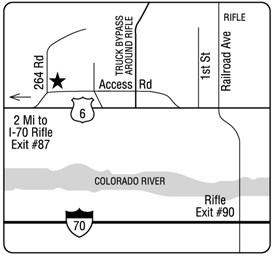69 County Rd. #264 From I-70: Take the Rifle Exit #90 North 1/4 mi. to the stoplight. Go left (West) 1 1/2 mi. Site is located at the Bulk Plant on the North Side of the Hwy.