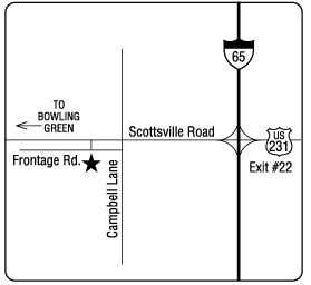 2315 Scottsville Rd. From I-65:Take Exit 22. Go West on US 231. Site located 2 miles on left.