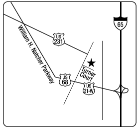 120 Turner Ct. From I-65:Take Exit 20 on William H. Natcher Pkwy. to US 68 Exit. Go East on US 68 1 mile to Turner Ct.