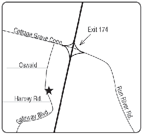 Northbd. I-5: Exit 174. Turn right on to E. Cottage Grove Conn. under I-5 bridge. Turn left onto Gateway Blvd. to site.