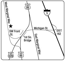 From I-5: Via Michigan St., cross 1st South Bridge to S.W. Front St.