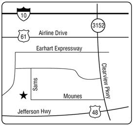 1000 Sams Blvd. Eastbd. I-10: Exit Clearview South. Go 3 mi. to Mounes St. Turn right on Mounes St. to Sams Blvd.
